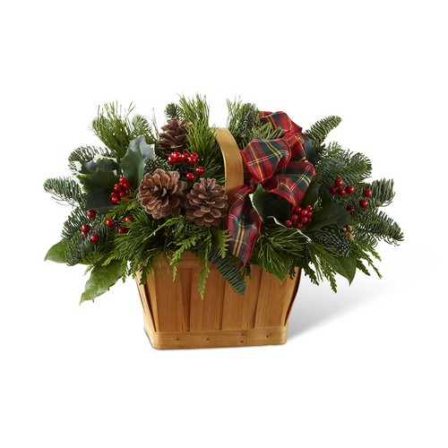 Adding warmth and a homespun look to your Christmas dcor, this fresh and fragrant floral arrangement is a wonderful way to bring color and life to any corner of the home. An assortment of Christmas greens and variegated holly are arranged to perfection in a rectangular stained woodchip basket, accented with clusters of red berries, natural pinecones, and a festive red plaid ribbon.