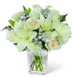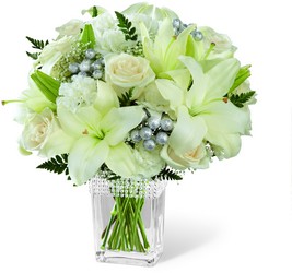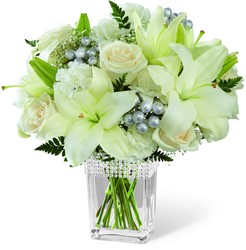 The FTD Intriguing Grace Bouquet speaks to a pure beauty and alluring style that can only be defined through these exquisite blooms. Drenched in the modern sophistication of white, these roses, Asiatic Lilies, carnations and Million Star Gypsophila are brought together and offset by lush green to create an impressive flower arrangement. Presented in clear glass vase with silver beading lined at the top and accented with silver glitter ball pics for an added touch of lovely, this mixed flower bouquet will make an excellent thank you, anniversary, or engagement gift.