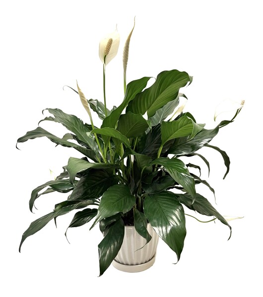 Known for its indoor beauty and ability to clear the air of contaminants, this brilliant green plant with white blossoms makes a perfect gift. Low-maintenance. High quality. Bet you never knew delivering elegance could be this simple! This Plant can sit on a table. Approx 22" tall x 18" wide Container Colors and style vary