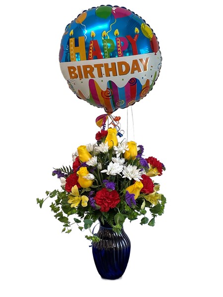 Make birthday spirits soar by sending this fabulously fun birthday bouquet and balloon. Bright primary colors make it perfect for guys and gals. Years may fly by but that doesn't mean birthday celebrations need to!