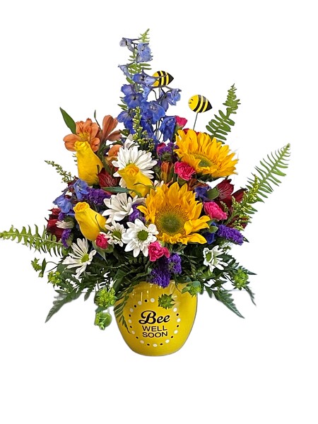 Boost their spirits and brighten their day with this garden of wellness! Hand-delivered in a sweet ceramic "Bee Well Soon" pot, this colorful arrangement is abuzz with delightful bee decorations - and your very best wishes for a speedy recovery.