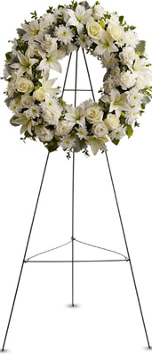 A ring of fragrant, bright white blossoms will create a serene display at any funeral or wake. The Serenity Wreath flower arrangement is delivered on an easel, and is a thoughtful expression of sympathy and admiration. A standing wreath created from fresh white flowers such as roses, Asiatic lilies, carnations and cushion spray chrysanthemums accented with greenery is delivered on an easel. Approximately 22" (W) x 22" (H) (Dimensions do not include easel.)