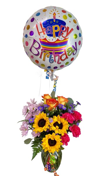 A bright and colorful way to send someone birthday greetings! This arrangement consists of sunflowers, roses, carnations, purple monte casino, daisies and a cheerful balloon to celebrate the occasion!